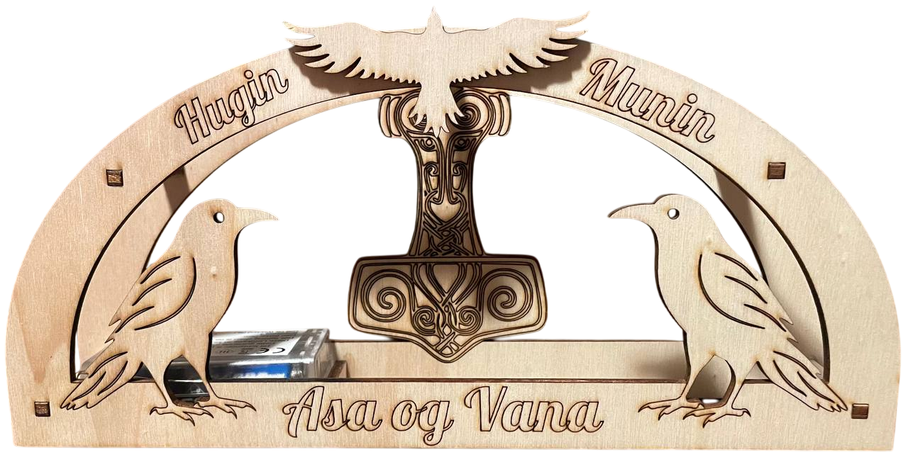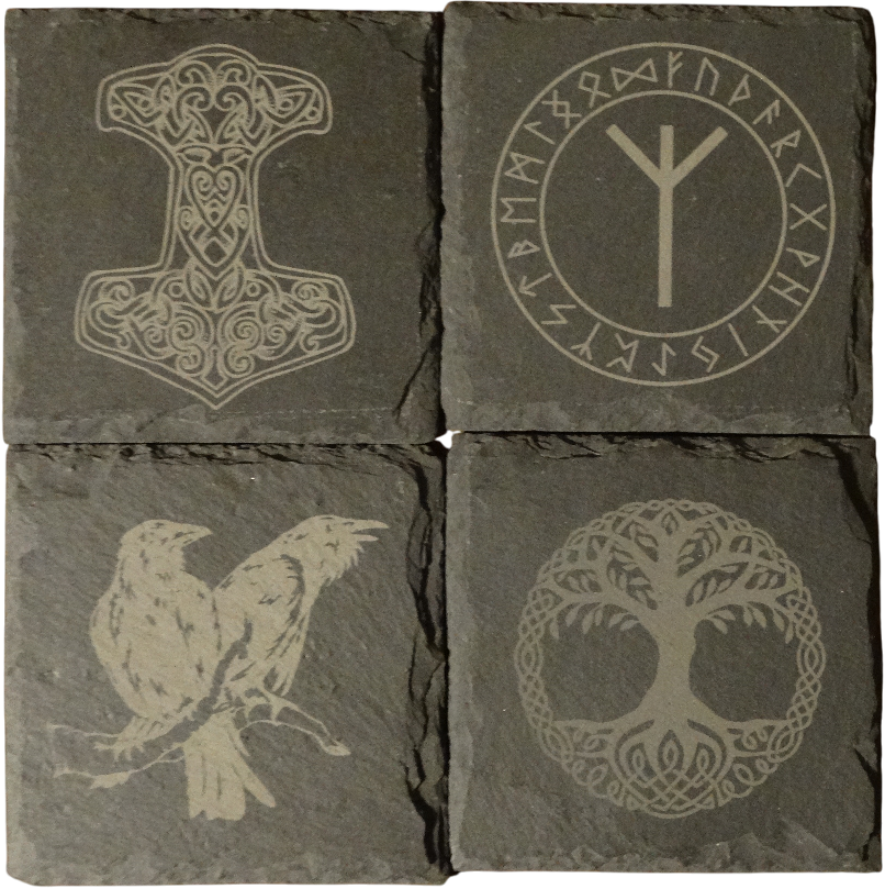 Motive Hugin und Munin, Thors Hammer, Yggdrasil, Algiz im Futhark